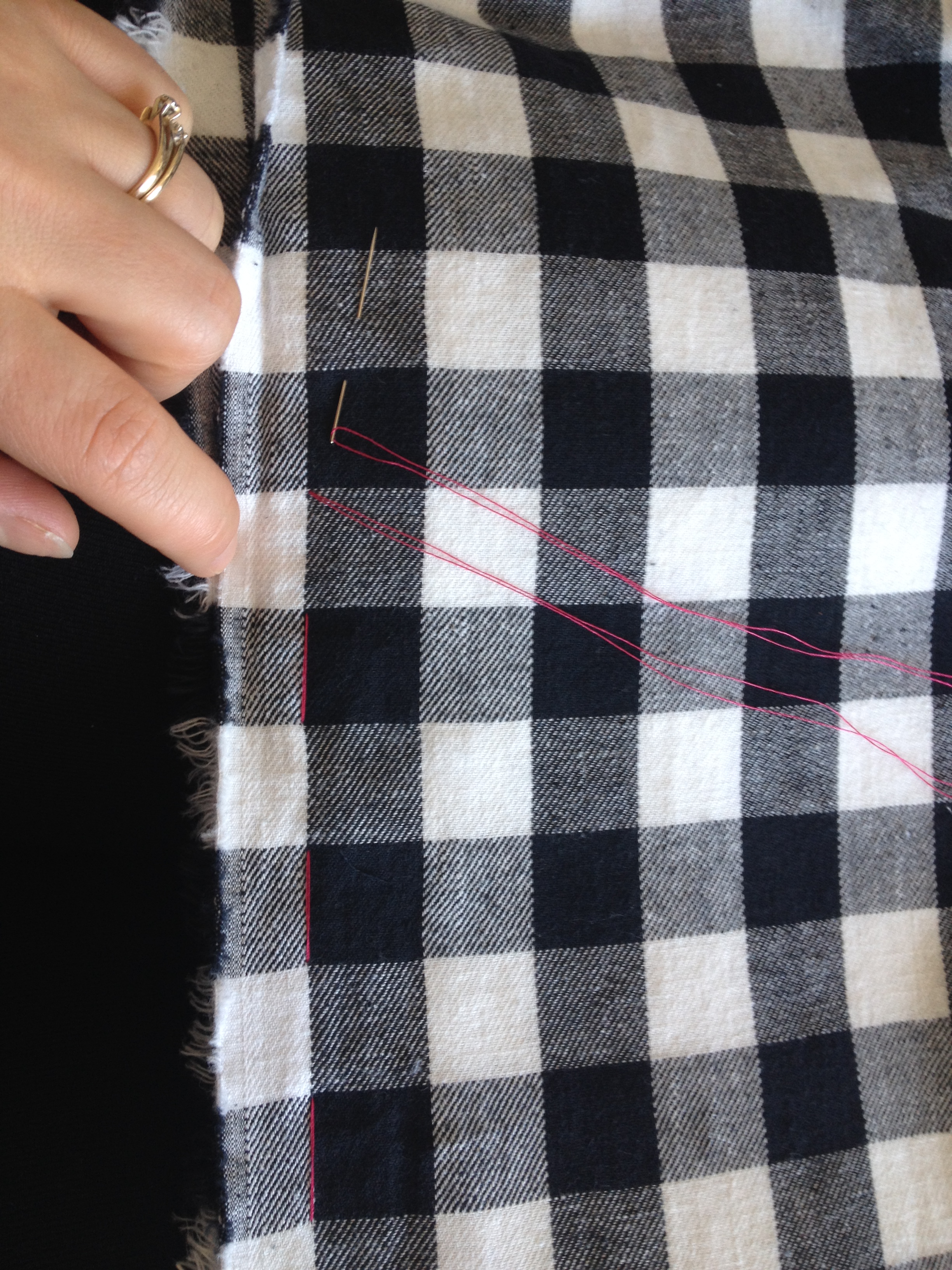 I am so glad I picked easy patterns for the blouse and skirt, because matching up the checks ended up being a huge pain. In doing my research, I discovered that pinning the fabric together when folded made sure that the checks stayed flat. I found that the pins had a tendency to move, so when making the skirt, I used a contrasting colour to tack the layers together.