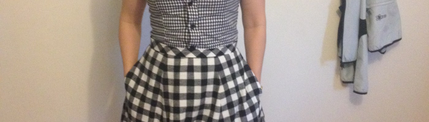 I finally wore the gingham blouse and skirt together and got Mike to take some pictures. Please excuse the bike helmets in the background. And the fact that I look like a hobbit. Mike doesn’t quite get that if he takes pictures from above (I.E. his eye level), I look about three feet tall.
