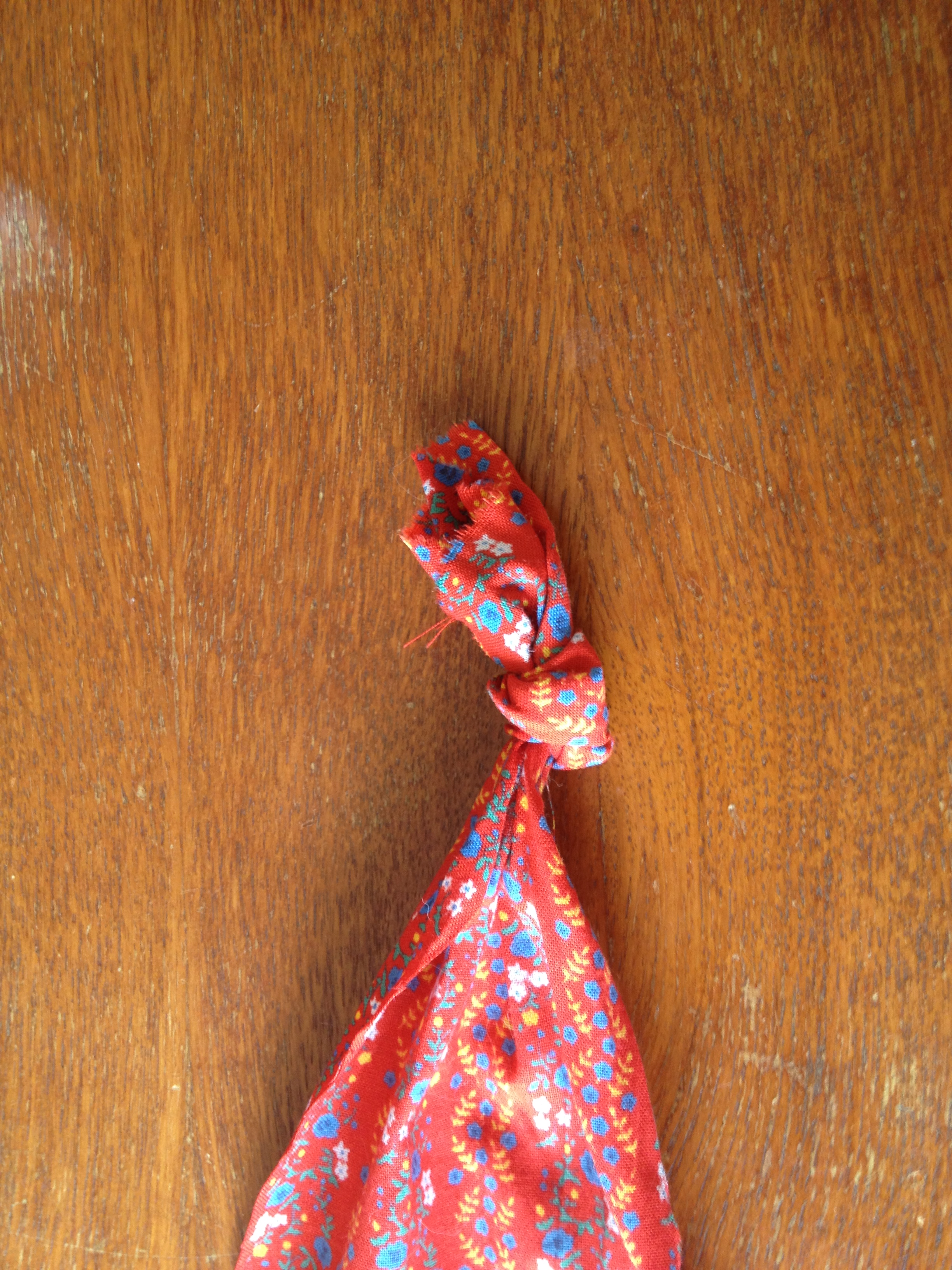 IMG_1275Knot one end tightly. You will be twisting the band of fabric as you roll it around the knot in a spiral. IMG_1281IMG_1283IMG_1285IMG_1286There is no right or wrong way to sew this up, just make sure everything is secured and that you keep the stitches on the back side. Make sure to finish off your stitches by sewing three or four stitches on the same spot.