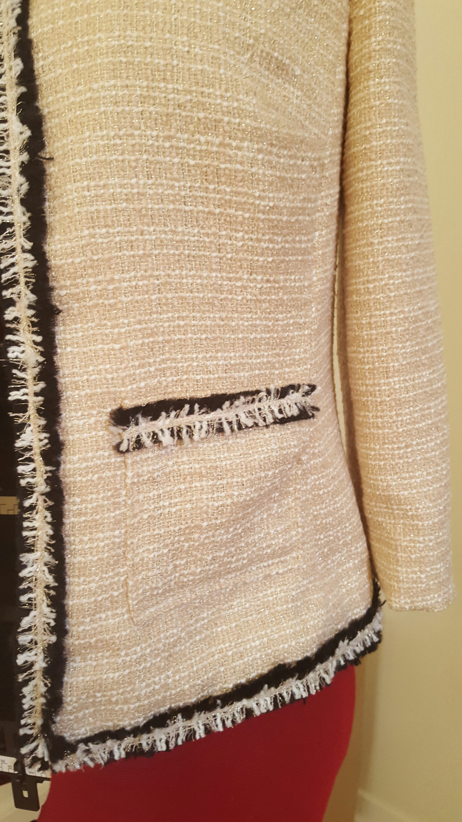 I recently took a class to make an unlined blazer resembling the classic Chanel jacket. I made a basic black version in class and whipped this one up over the weekend as homework. Because I couldn’t not make a jacket to look like the Chanel runway styles, I altered my pattern a little and added some flourishes.