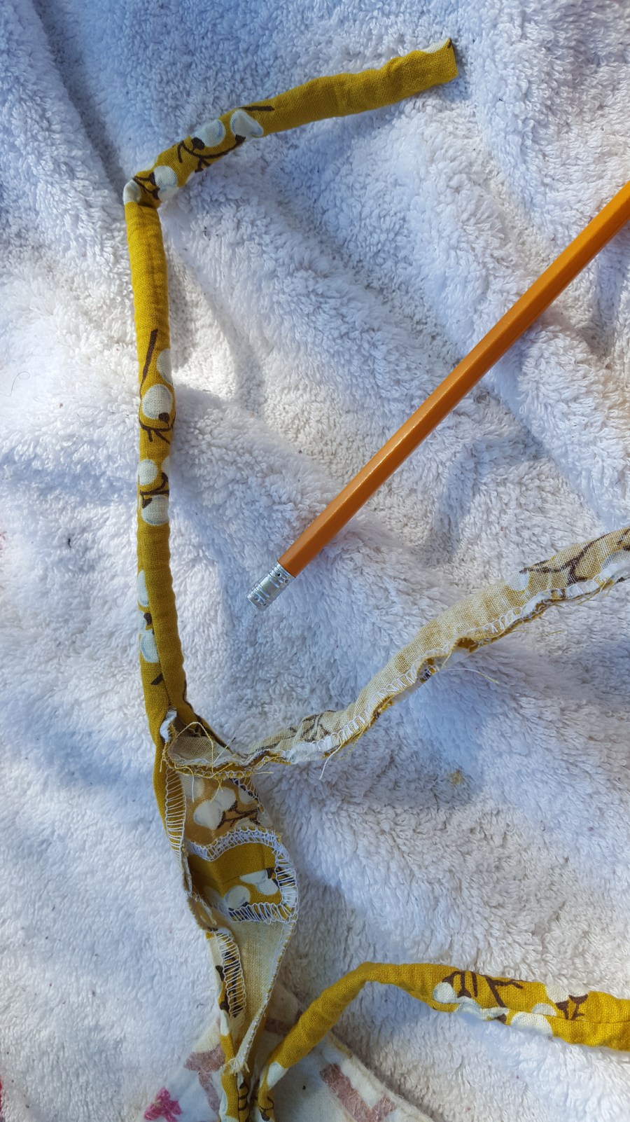What I did: We went to the campground beach, so I decided to bring along my sewing bag instead of a book. I very casually worked on turning my drawstring right side out, but decided to put it away when the eraser from the pencil I was using to shove fabric came off inside.