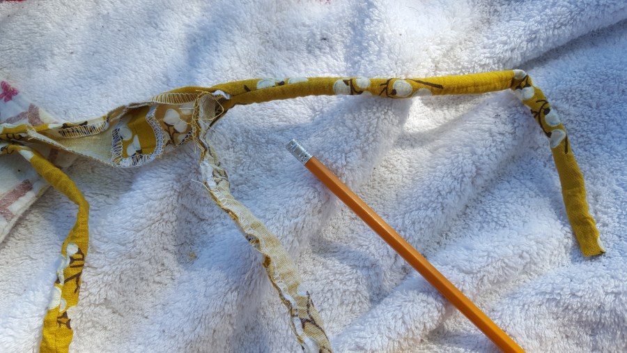 What I did: I went on a bit if a tear today as I’m trying to get to a point where I have hand sewing I can do while camping this weekend. I sewed the drawstring casing, did the hem (bias-bound) and got the drawstring started. I sewed it, but didn’t turn it right side out since I figured I could bring that camping, too.