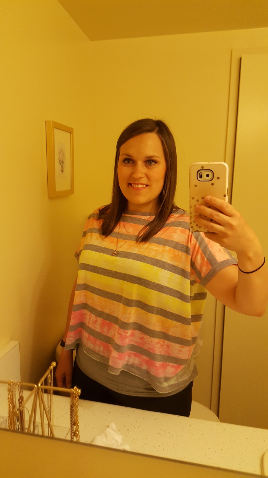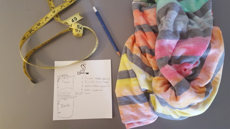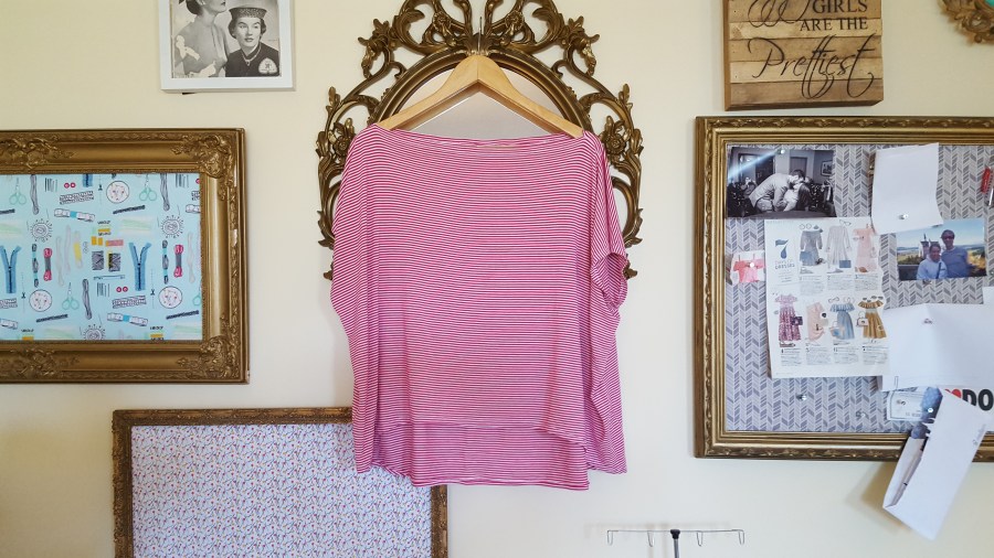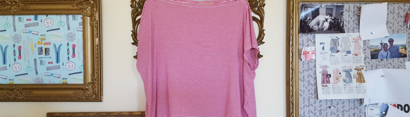 I made two unintentional muslins before succeeding with the fuchsia striped jersey. The firat iteration was in a fun grey and tie-die stripe that worked out except that I goofed on the length and inadvertently made a crop top.