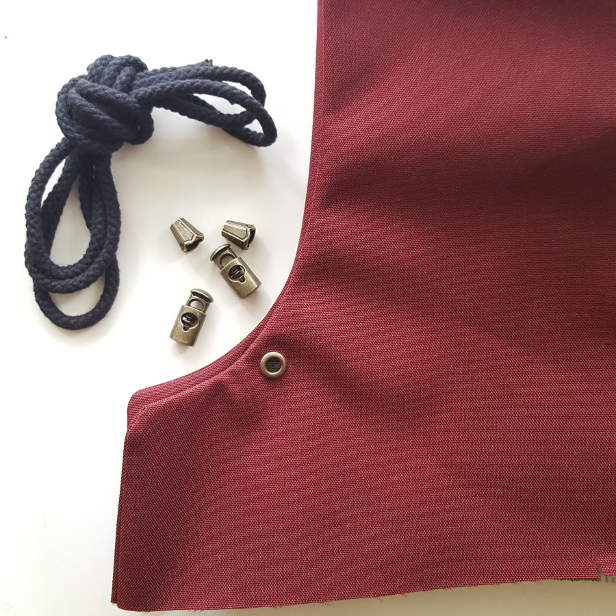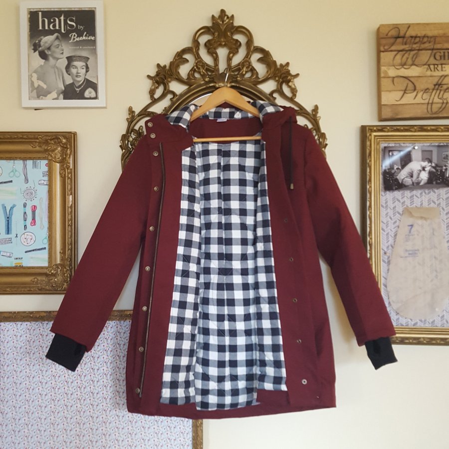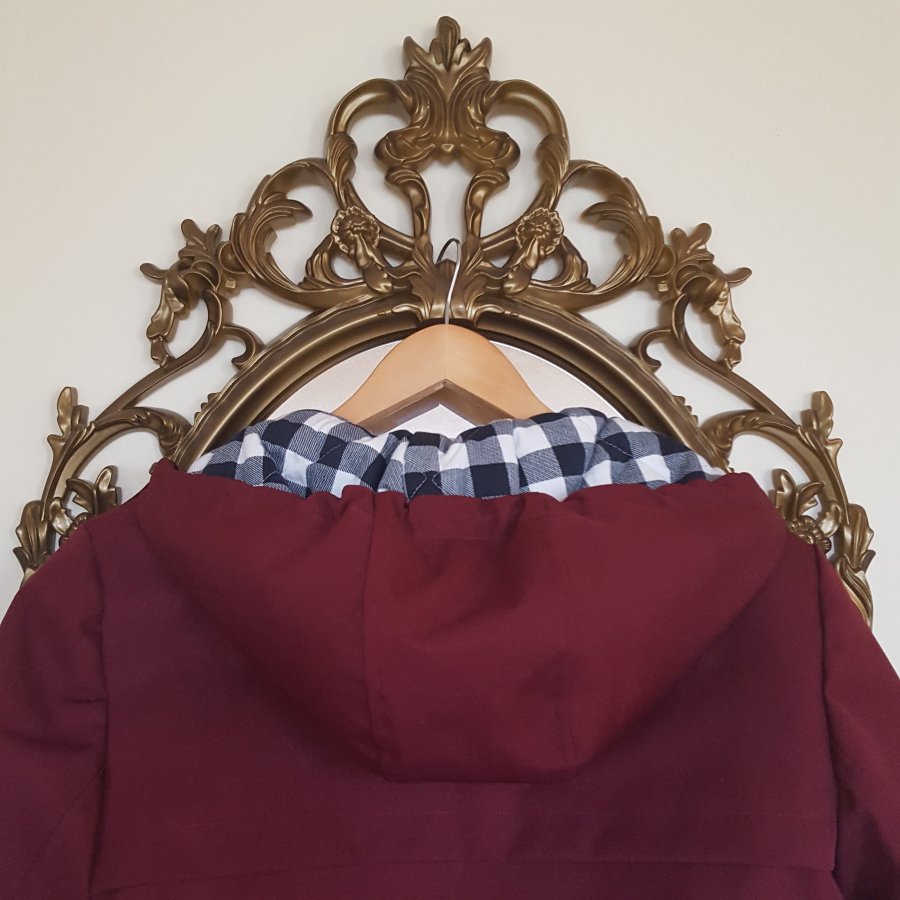 I got the fabric and lining at Tonitex for a steal and this might be the first time ever I actually saved money making my own clothes. The outer fabric is a waterproof-coated canvas in burgundy and the lining is a pre-quilted lining with a layer of polyester batting and the cotton black and white (blue and white?) check. I also bought snaps and drawstring pulls, but opted to buy the hardware kit offered by Closet Case as they were prettier than the ones I bought and I thought it would make following the sew-along easier.