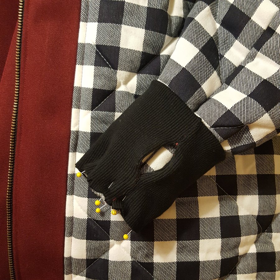 The second way I customized my Kelly was adding a cuff. I find it really awkward to wear a heavy coat without mittens, (This might be as a result of always too-long RTW sleeves…), so I added a ribbed cuff. This is possibly the easiest hack ever and literally takes one extra seam on each arm. I prepared my cuff with a thumbhole cuff out of an 8 x 8″ square of ribbing scrap I had on hand.
