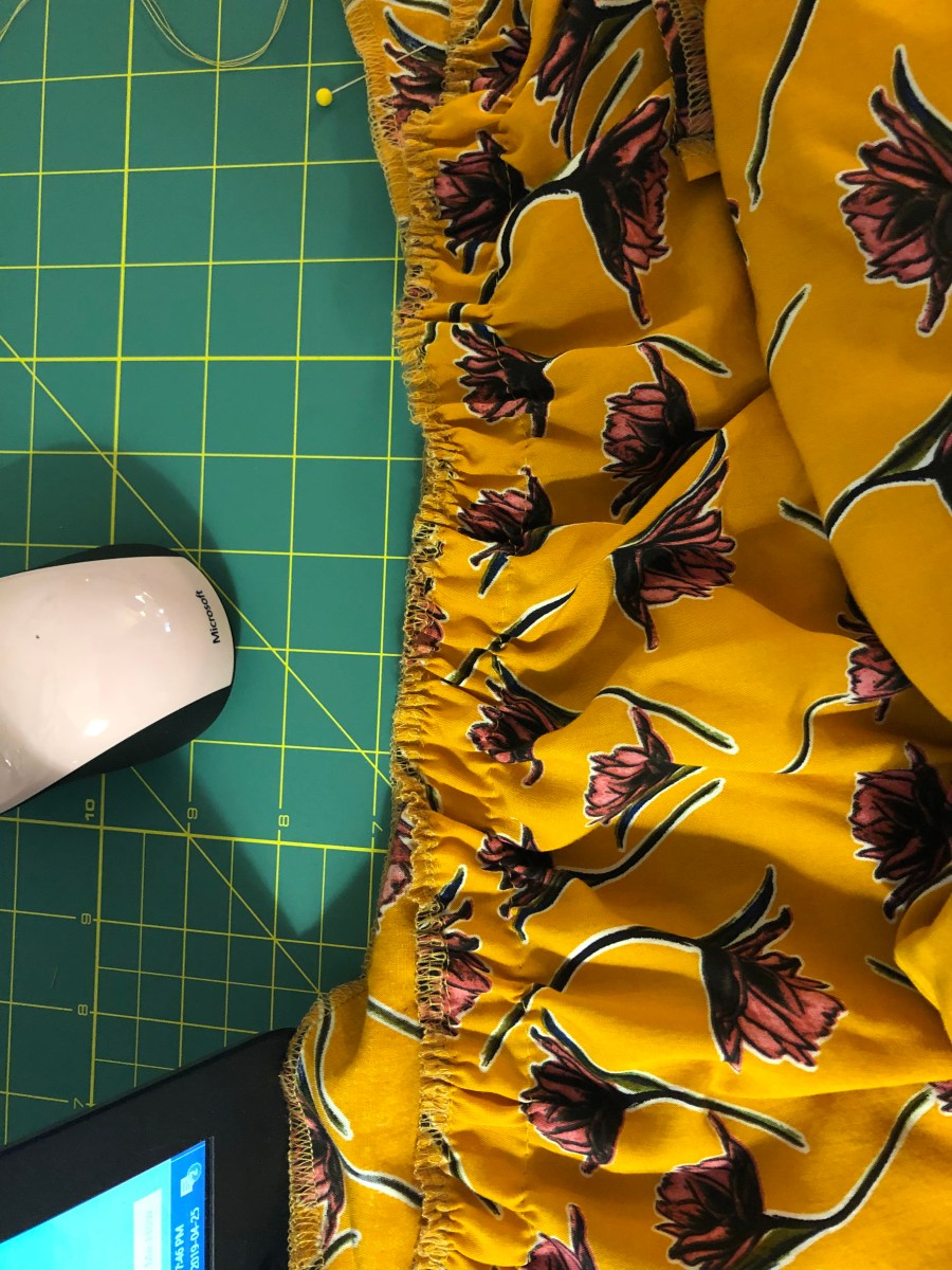 Because I removed the pockets and the front slit, the skirt was ridiculously simple to sew up. I basically gathered the front to the regular size, sewed the side seams, added the drawstring casing and attached it to the bodice. When gathering, start and finish your gathers about three inches from the side seams as you don’t really need it there. I also suggest doing four lines of gathering. Do two lines of gathering around the seam that will attach the bodice and skirt together (the seam allowances 3/8 so stitch at 1/4 and 1/2 inch) but ALSO one line of stitching on either side of where the drawstring casing will attach to the skirt. The casing is an inch wide, so your two lines of gathers will be at 1 1/4 and 1 1/2. This is really important because if you don’t also gather at the bottom of the drawstring casing, you will have uneven or large puckers that just won’t look good on your belly.