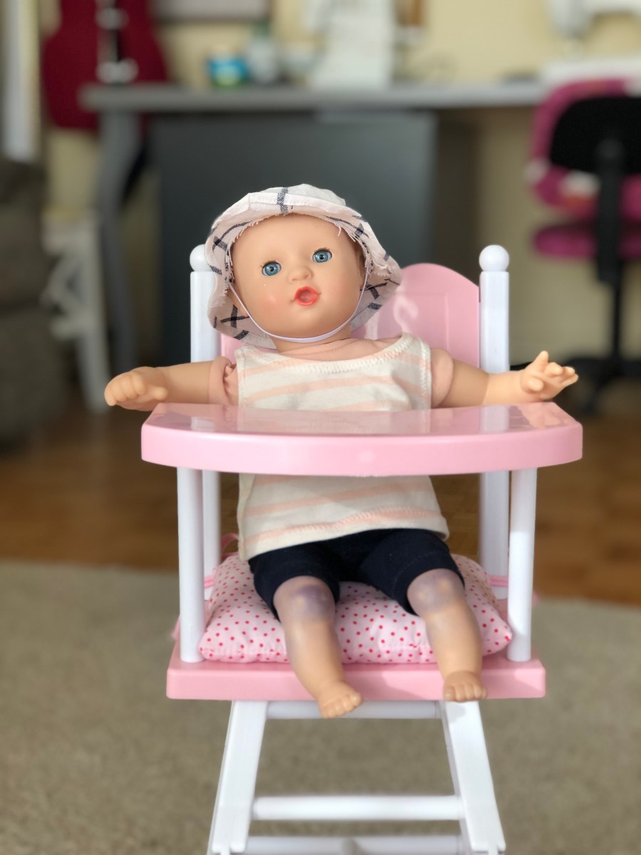 My kiddo’s baby doll is a 12-inch Melissa and Doug Mariana and I had a good deal of trouble finding patterns online to fit her. Most 12-inch doll patterns are made for girl dolls who have completely different proportions. I did find one pattern meant for water baby dolls that seemed to fit okay with some minor modifications.