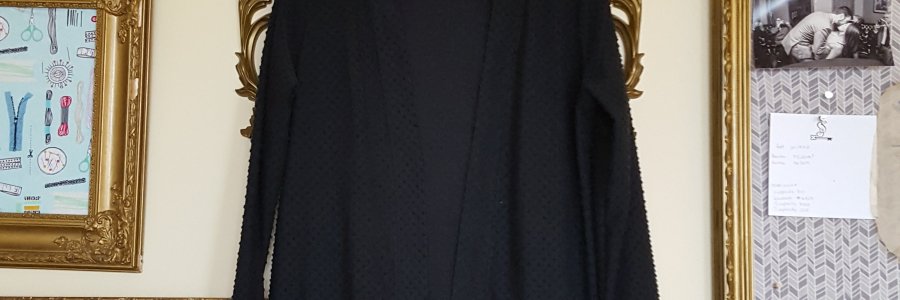I used a black jaquard with raised fluffy dots that photographs terribly, but I promise is awesome. It only barely had the minimum required 40 per cent stretch, so I sized up when I cut it out. This ended up being unnecessary and it looked a little too slouchy, so I took it in a quarter inch down the side and around the arm scye. This was super duper easy as the sleeve isn’t set in.… Read More Done and Done: A nubby black Blackwood Cardigan